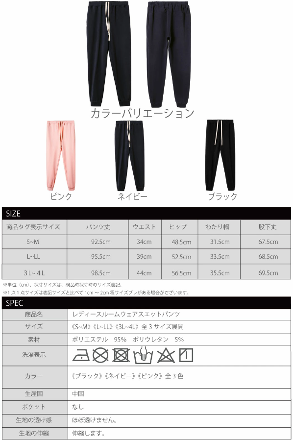3L~4Lサイズ:パンツ丈98.5cm、ウエスト44cm、ヒップ56.5cm、わたり幅35.5cm、股下丈69.5cm