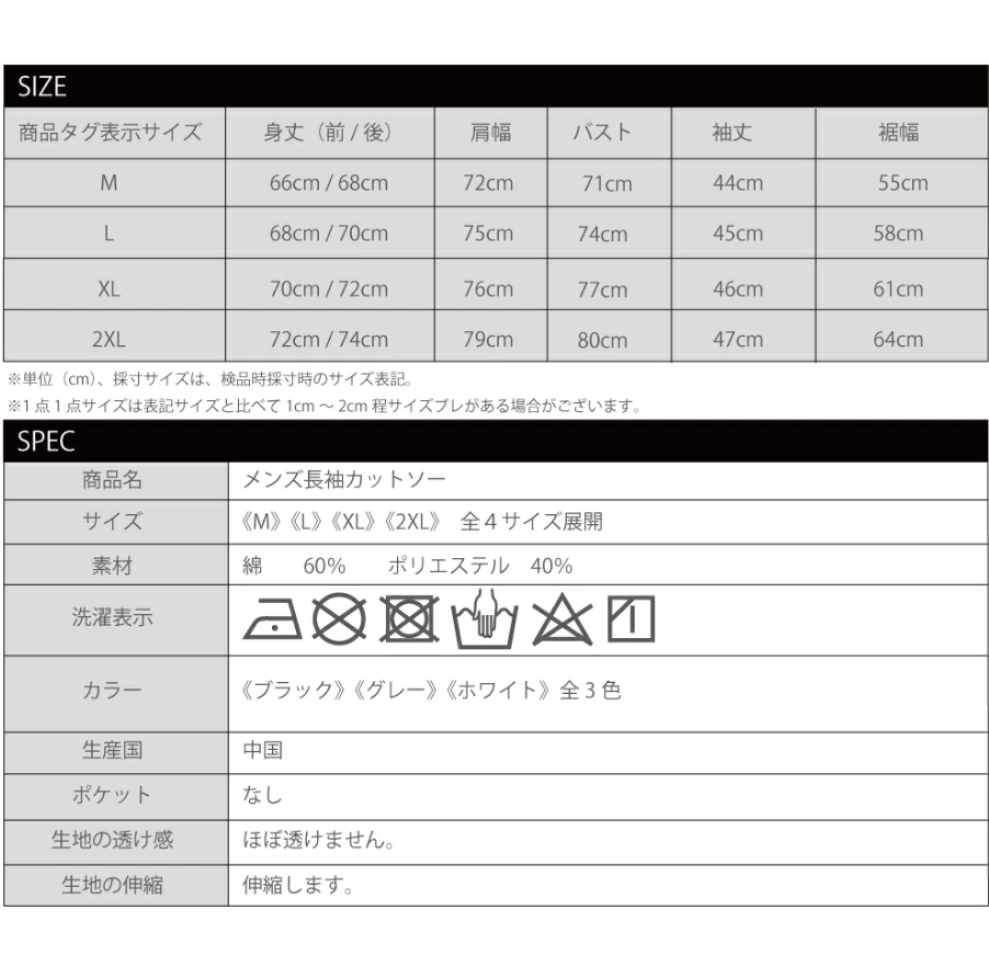 2XLサイズ:身丈(前/後)72cm/74cm、肩幅79cm、バスト80cm、袖丈47cm、裾幅64cm