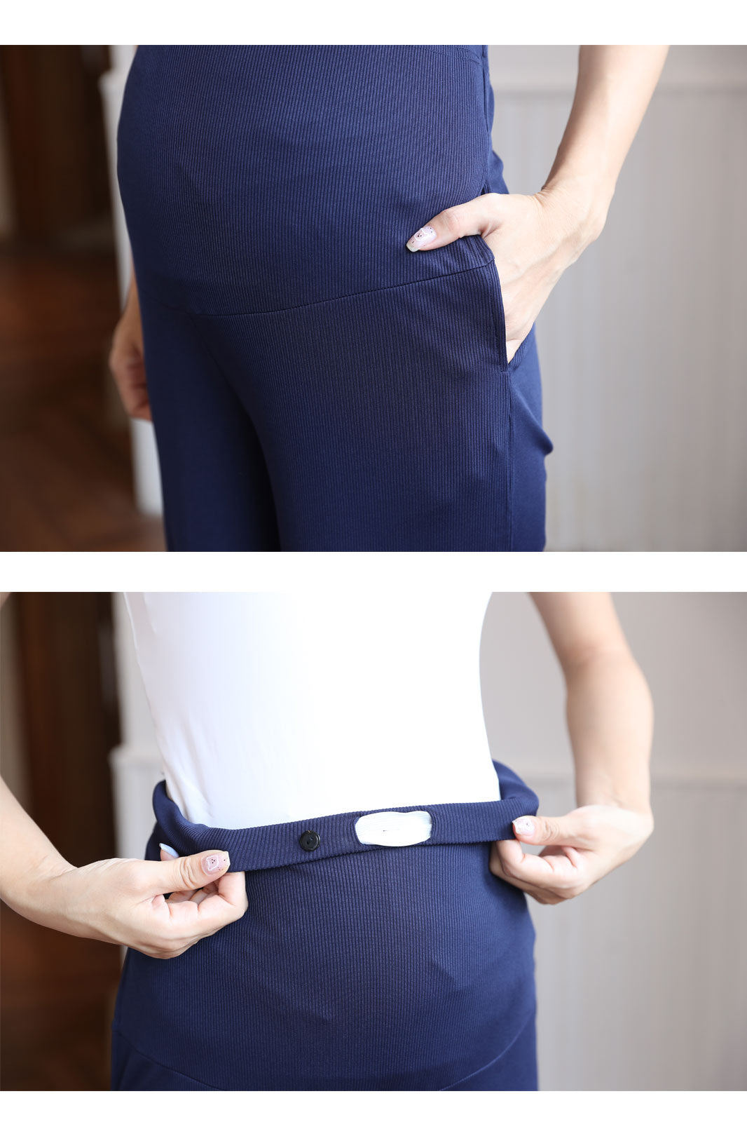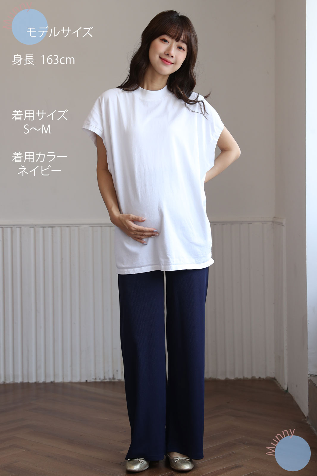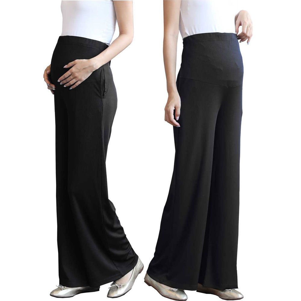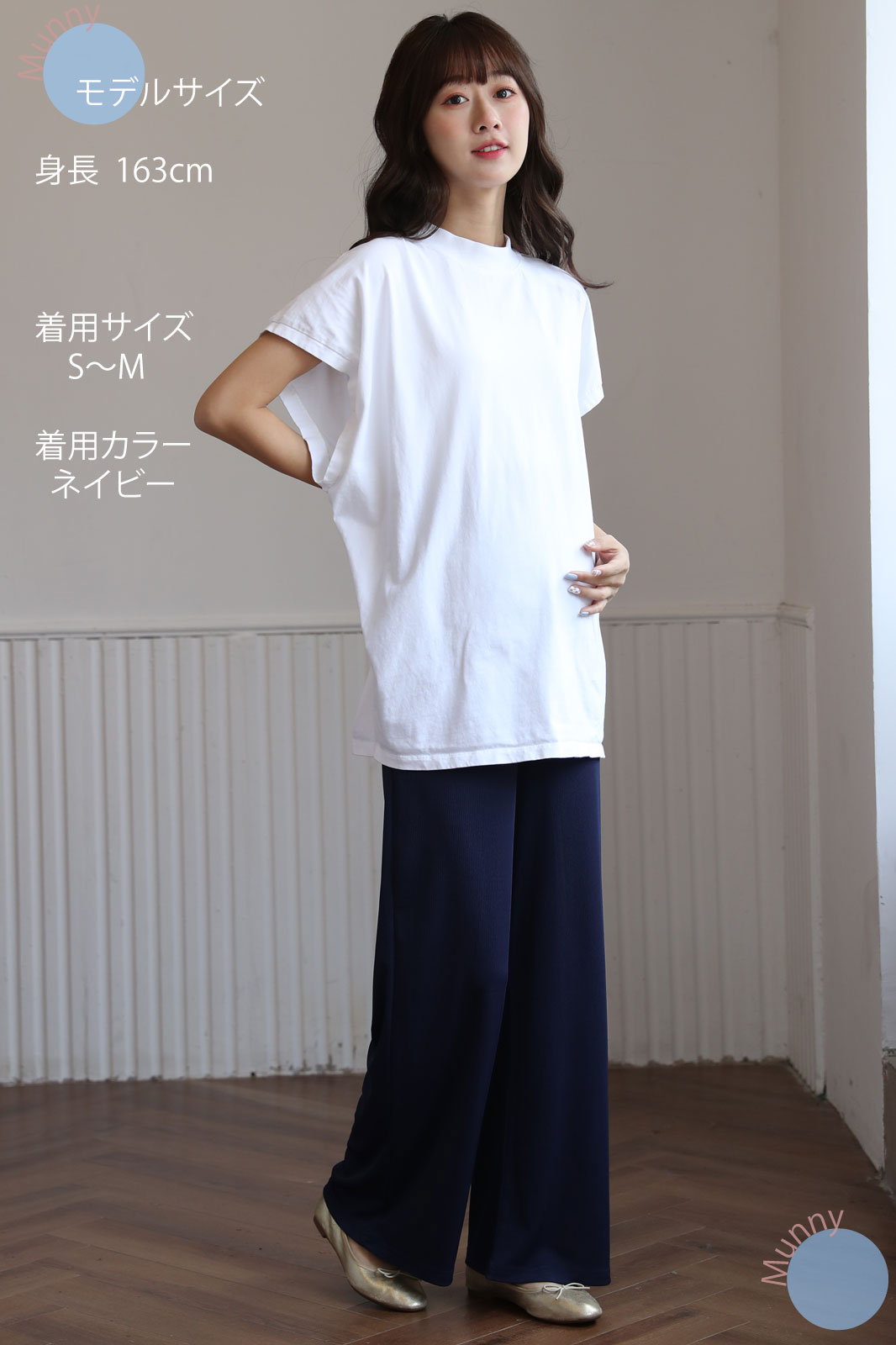 リブ素材ならではの伸縮性で、お腹が大きくなっても締め付けず、快適に過ごせます。さらに、ワイドシルエットが足のラインを美しくカバーしてくれるので、体型が気になる時期でも安心しておしゃれを楽しめます。