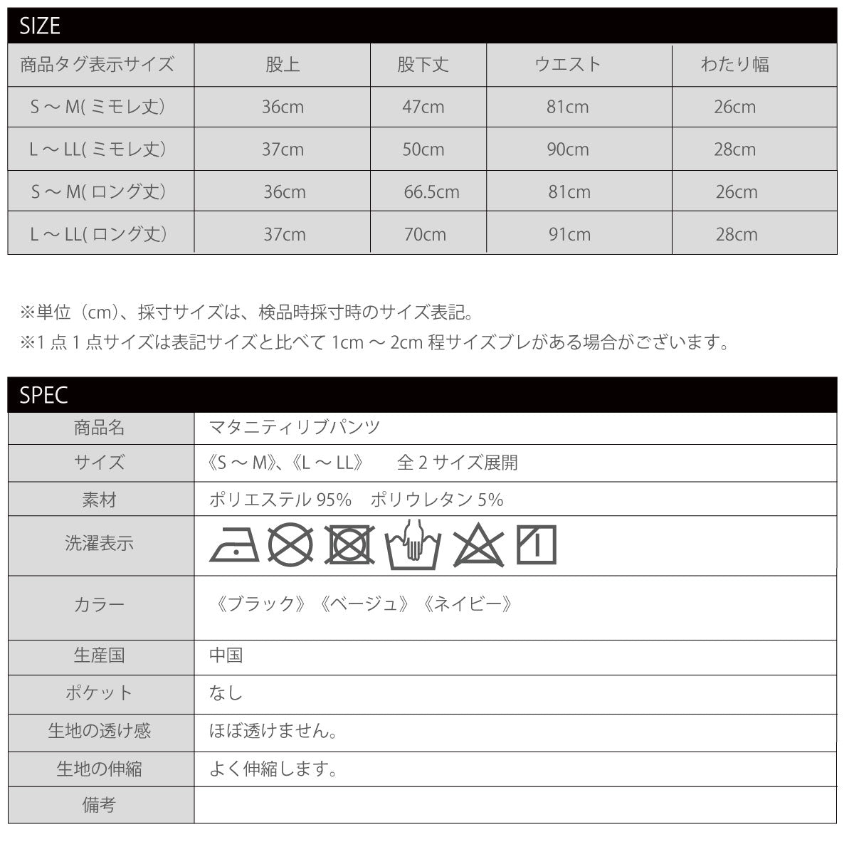 S~M:股上36㎝、股下丈64㎝、ウエスト79㎝、わたり幅23㎝